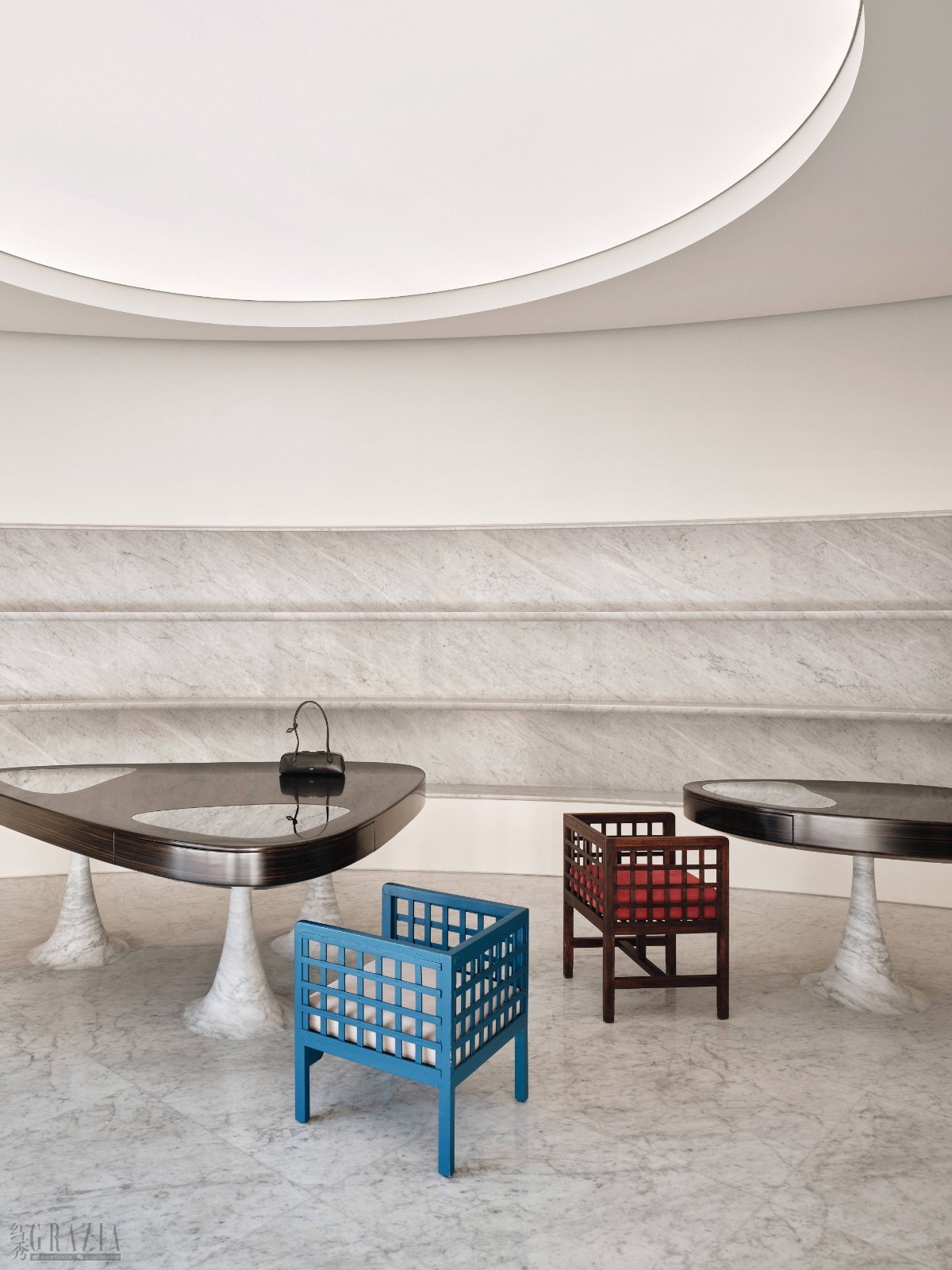 室内亦延续着同样的纯粹美学。弧形有机线条与锐利几何结构形成鲜明对比,致敬ALAÏA时装风格语汇。大理石陈列架铺设于店铺一层空间,雕塑感展示台自地面升起,展现品牌皮具作品与其卓越工艺。