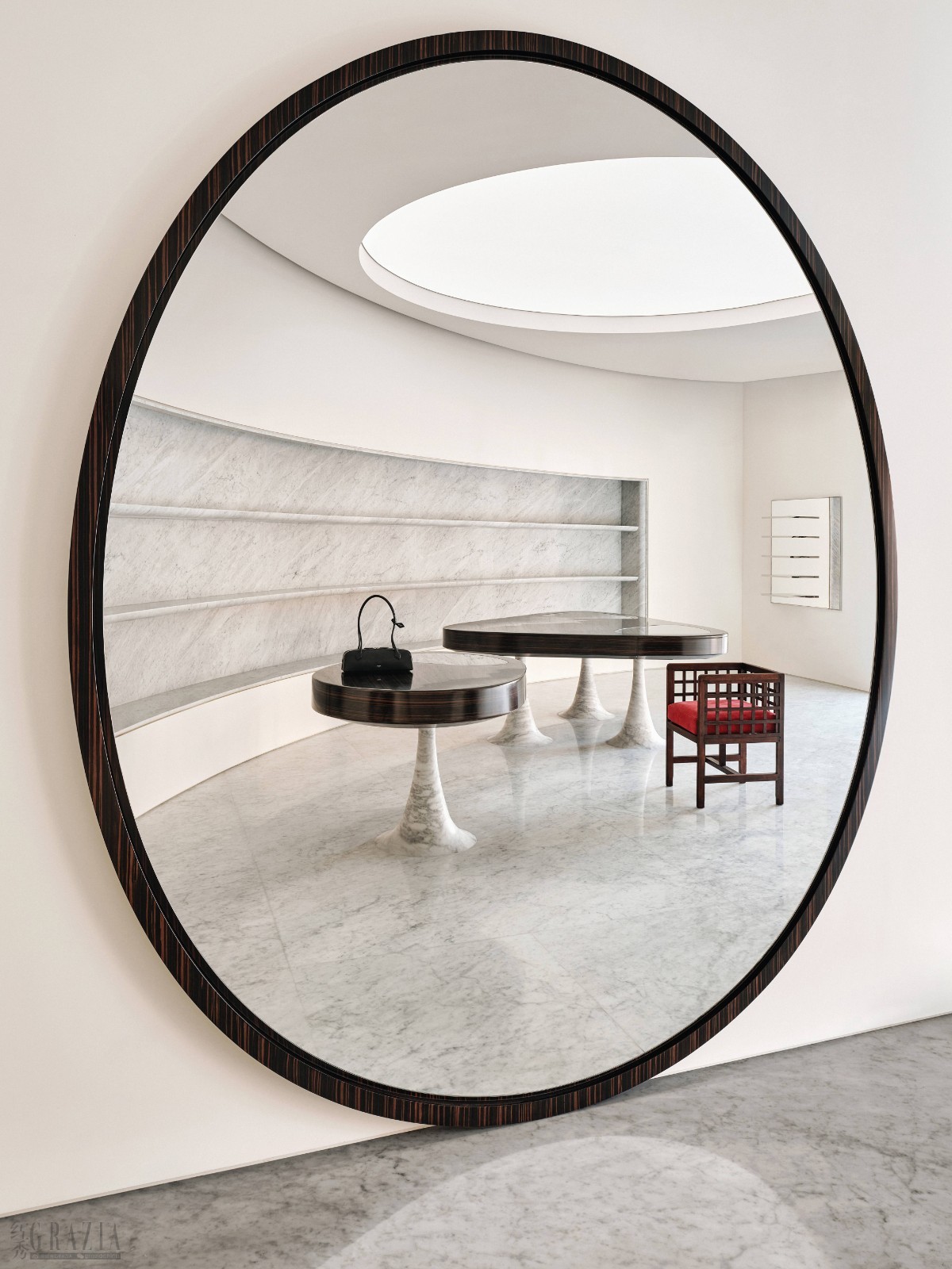 醒目的外立面采用坚固的卡拉拉大理石包裹,圆形与弧形窗口点缀其中,重释ALAÏA标志性镂空图案。宏大而简约,带来品牌建筑语言的全新表达。