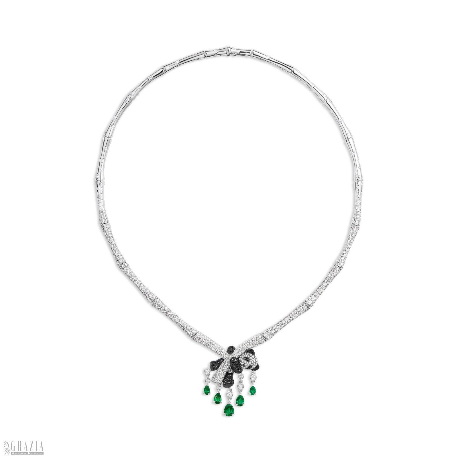 Qeelin Bamboo 高级珠宝系列 18K 白金祖母绿、钻石和黑钻项链、耳环及手镯