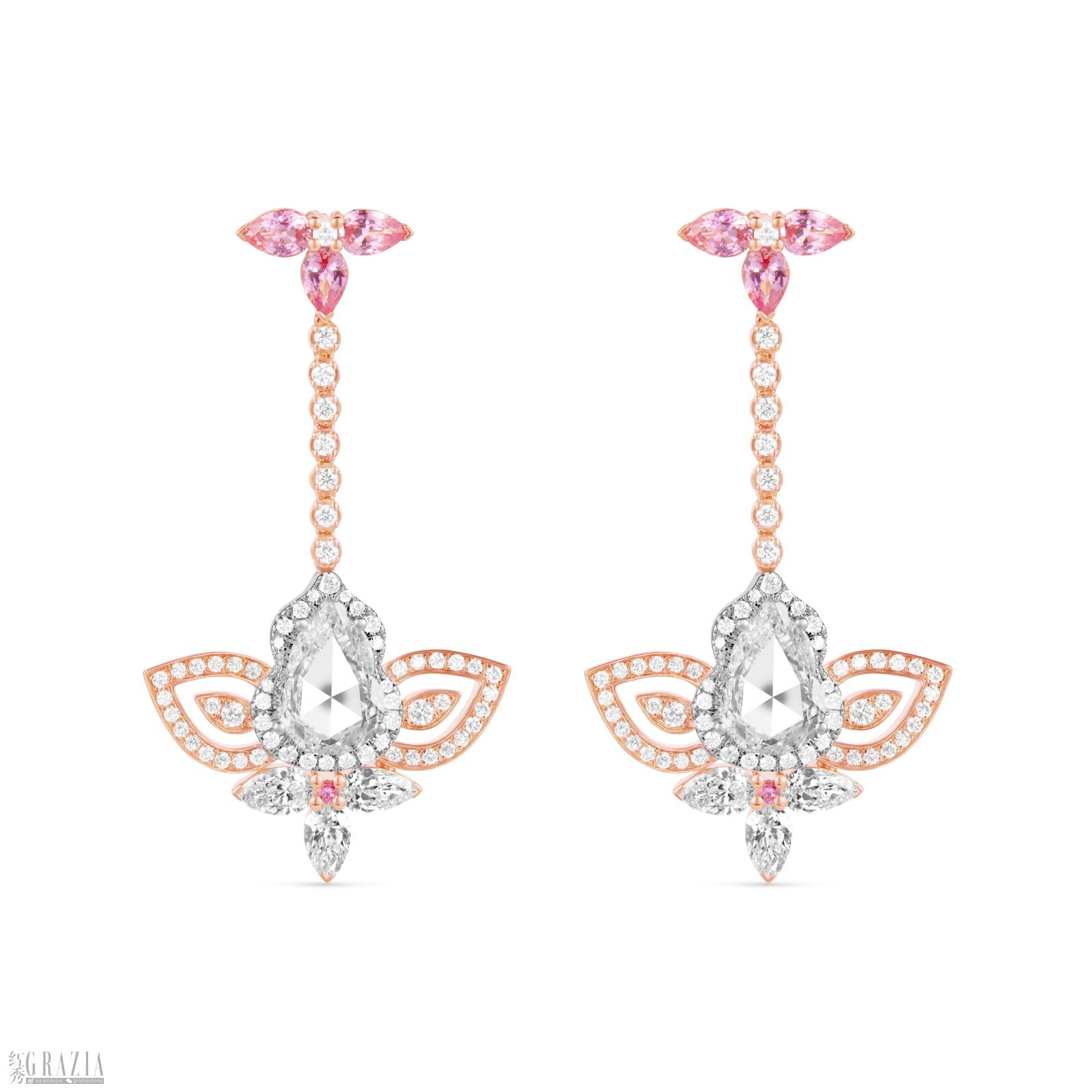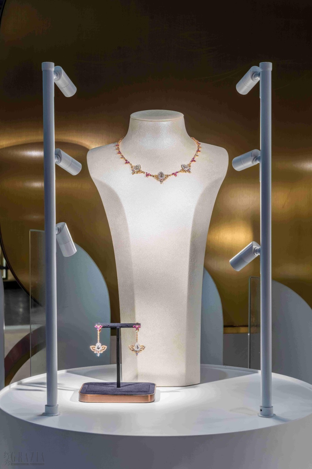 Wulu Diamond Lotus 高级珠宝系列重塑“出淤泥而不染”的莲花意象,以18K白金与玫瑰金镶嵌钻石及粉红蓝宝石,如水墨晕染般散发出华丽女性气息。系列最大亮点是品牌耗时十年独创的葫芦形钻石切割工艺,使花瓣呈现颤动的微光,巧妙勾勒颈部线条,并与自然美学完美相融。