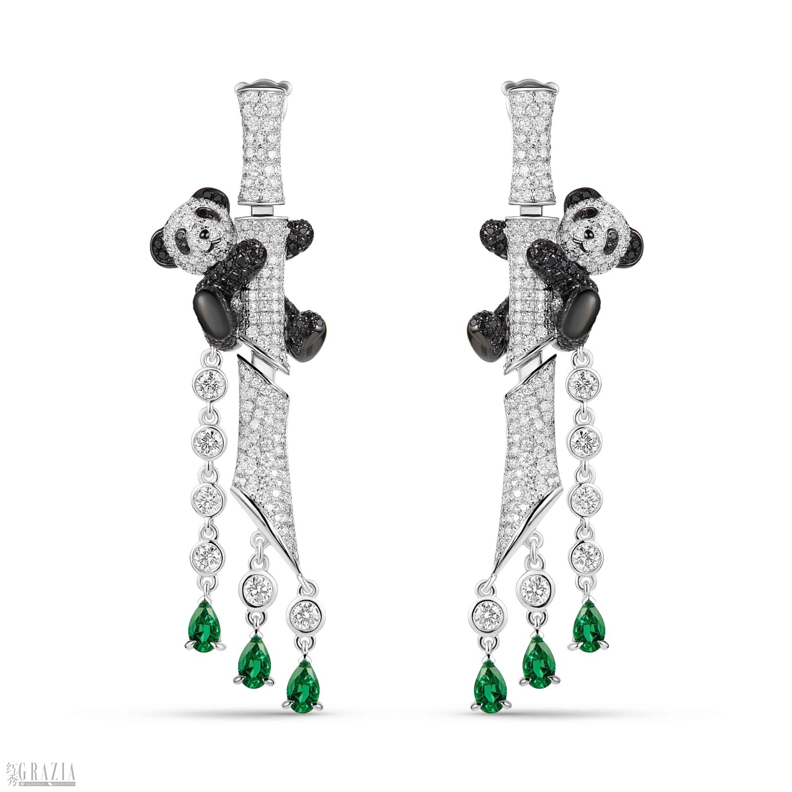Bamboo Bo Bo作品将Qeelin经典熊猫形象与竹子结合,展现其与自然栖息地的亲密关系。作品以18K白金、钻石与祖母绿,通过密镶与衔接技术打造灵动竹节,尽显Bo Bo嬉戏竹间的自然野趣。