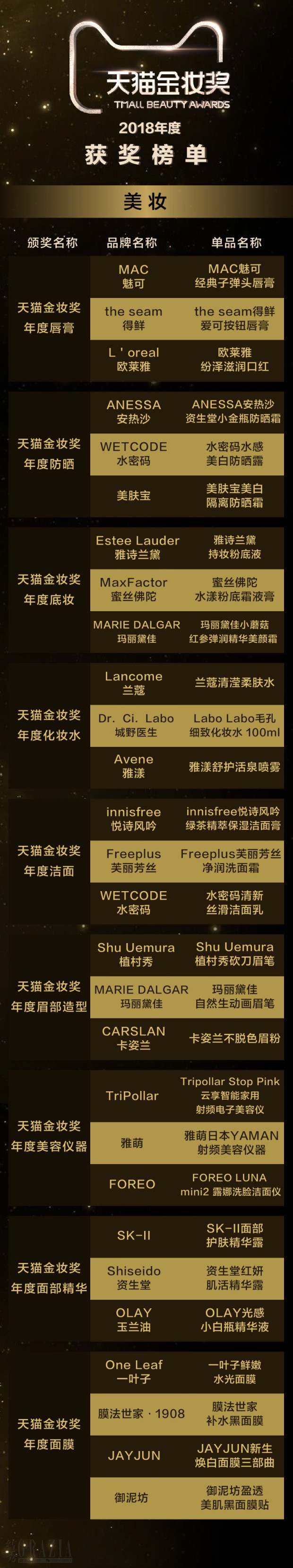 天猫金妆奖最全榜单这一年消费者最爱买什么?