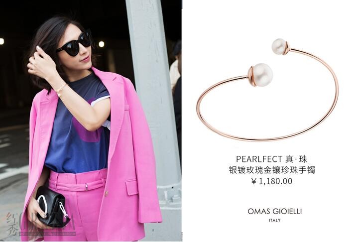 一身玫粉色休闲西服套装,搭配黑色太阳镜和红色镭射高跟,腕间的珍珠手镯更显霸道女总裁王者之气。