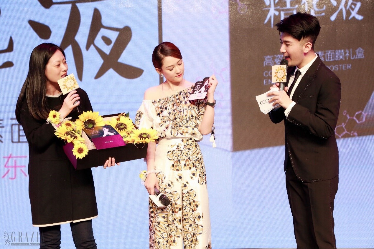 (上海新高姿整合营销传播总监陈晓青女士为陈乔恩带来定制款面膜)