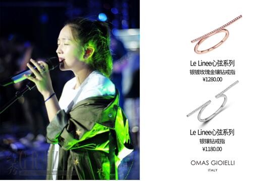 歌手何洁选择弧形和一字形镶钻戒指叠戴,让她表演时标志性的手指击打话筒的动作更添几分帅气;