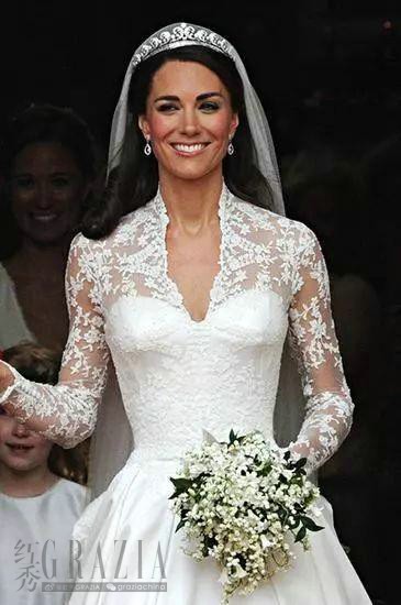 与威廉相恋多年的凯特,一向中规中矩,所以婚纱的设计也很传统。蕾丝,V领,精致的妆容,Alexander McQueen首席设计师设计的婚纱,完美融合了古典与现代元素。