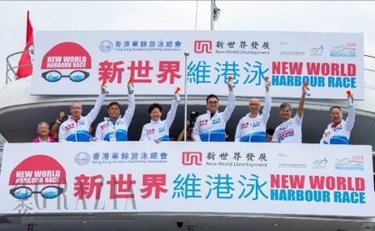 行政长官林郑月娥(左三)、劳工及福利局局长罗致光(右二)、环境局局长黄锦星(右三)、新世界发展有限公司执行副主席兼总经理郑志刚(中)、新世界发展有限公司执行董事欧德昌(左一)及薛南海(右一),联同香港业余泳总会会长王敏超(左二)主持鸣枪仪式,为竞赛组赛事揭开序幕。