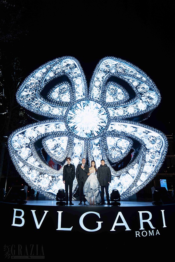 (从左至右)蔡徐坤、宝格丽首席执行官Jean-Christophe Babin、林心如、北京SKP总经理罗志伟共同点亮Fiorever咏绽灯光艺术装置