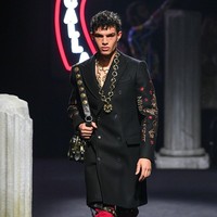 人字粗花呢大衣上点缀拉丁字母刺绣,采用深红色和金黄色的缎带,荷叶边和蝴蝶结,仿佛古老的雕刻石板,赋予挺阔有型的男装定制晚礼服的优雅和戏剧性。在角色造型上,向费里尼电影《爱情神话》、《8 ½》、《卡萨诺瓦》、《罗马》和《甜蜜的生活》的角色原型致敬。