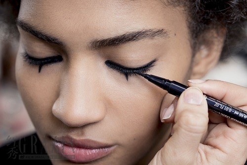眼妆:首先使用Dior迪奥惊艳秀场眼线液091整体勾画,然后用CRAYON EYELINER WATERPROOF NOIR TRINIDAD 094(中国未上市)将其晕染。DIORSHOW KHÔL BLACK KHÔL 099(中国未上市)用于填满下睫毛根部。最后根据模特肤色选用不同色调的Dior迪奥眉笔,打造立体眉形。
