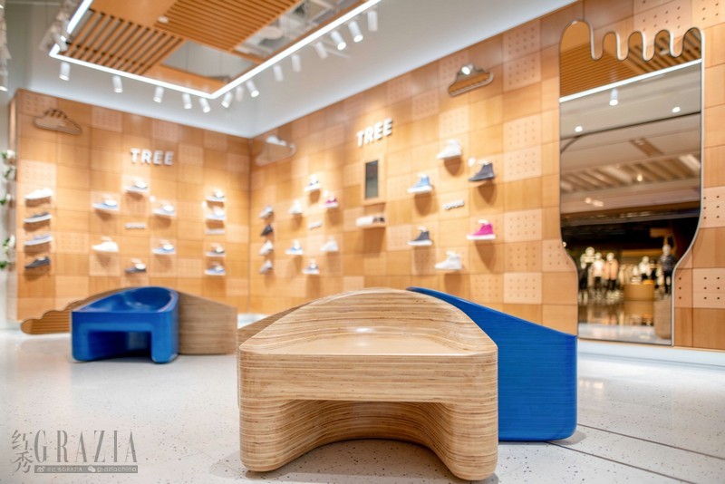 经典Wool系列产品展示于干净明朗的浅色背景中相得益彰;原木色调背景中有序陈列了Tree系列多款产品,彰显极简美学。店内造型独特的镜面,增加空间通透感的同时,也营造了一种轻松幽默的氛围。由Allbirds设计总监Jamie McLellan特别设计的座椅,其可前倾的细节确保了顾客试穿时的舒适感。