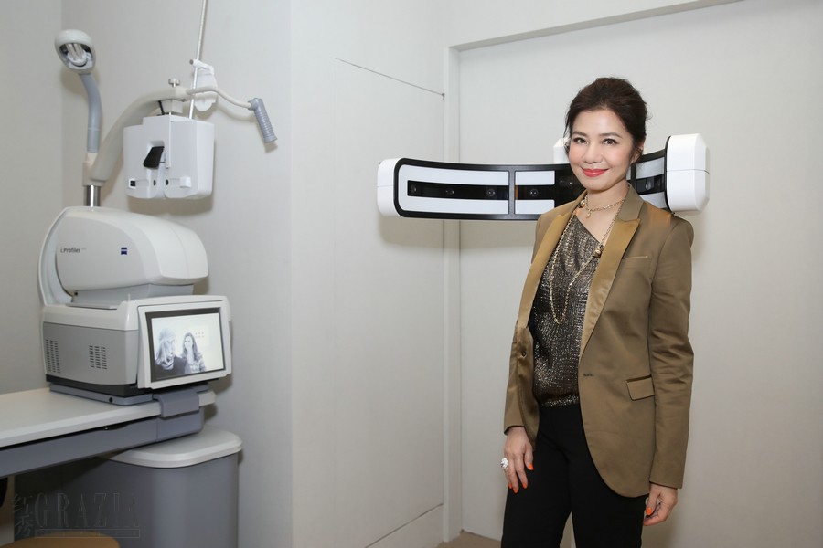 著名影星钟楚红在溥仪眼镜王府中環店内体验蔡司三维定位配镜系统(ZEISS VISUFIT 1000)