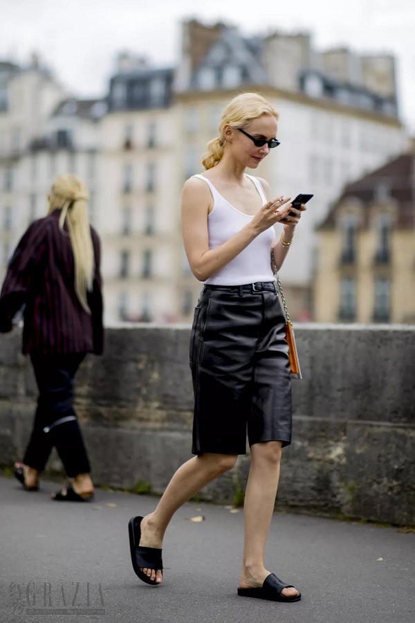 穿上拖鞋,便是潇潇洒洒、无拘无束的随性女孩。夏天就要过去了,抓紧时间穿背心或者白Tee搭配皮革百慕大裤吧!