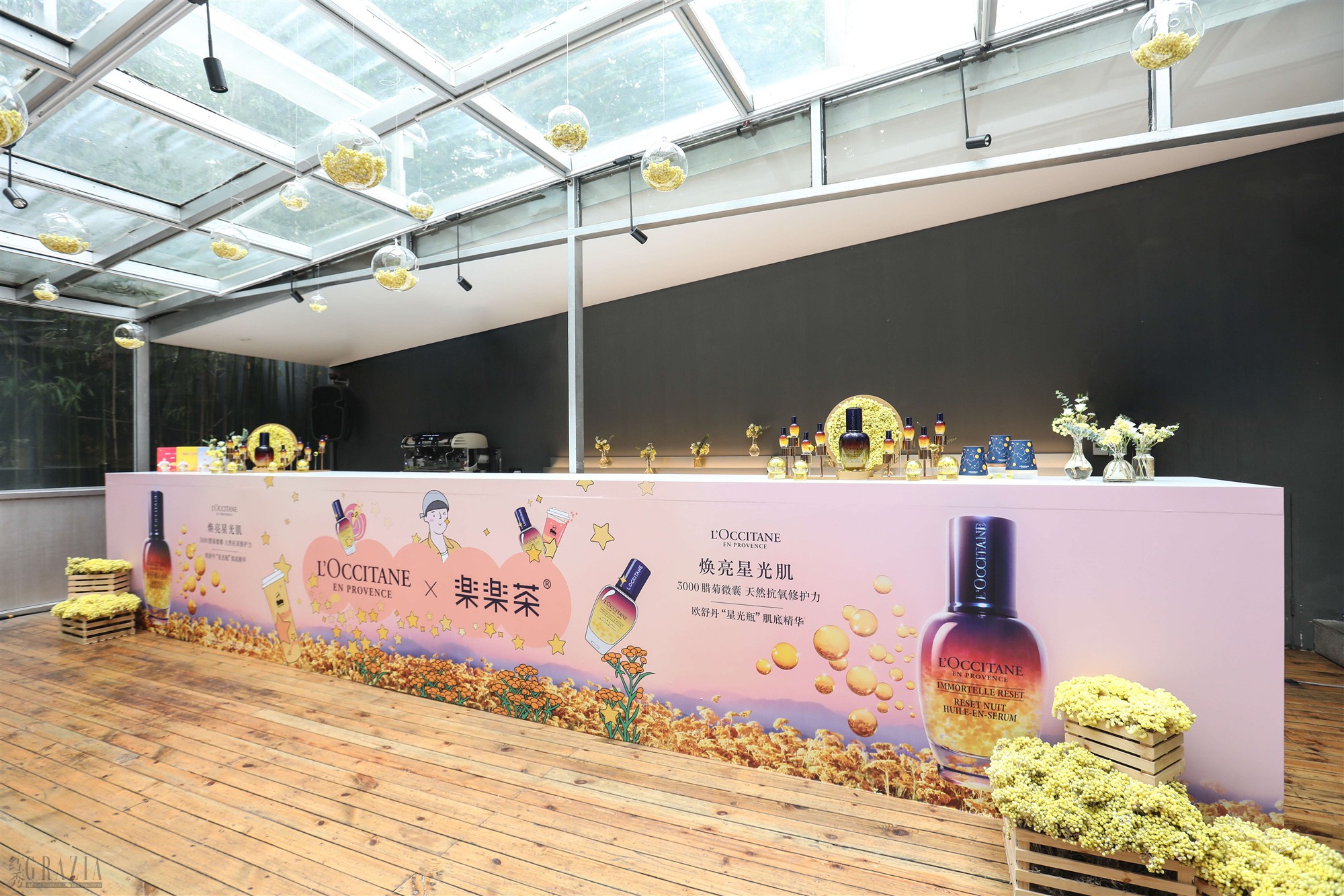 在别出心裁设置的茶饮区,欧舒丹跨界联合著名茶饮品牌乐乐茶,重磅推出多肉菠萝王限量饮品。清冽茶汤搭配酸甜菠萝果肉,清爽可口;粒粒Q弹的黄金大甘露,如点点星光散布苍穹,与星光瓶中的黄金腊菊微囊颗粒有着异曲同工之妙,似繁星般焕亮闪耀。同样自然严选,同样坚持优良品质,这次理念相近的合作,不仅为现场嘉宾提供了惊艳茶歇,更推出精致联名礼盒,细致用心收获一片好评。