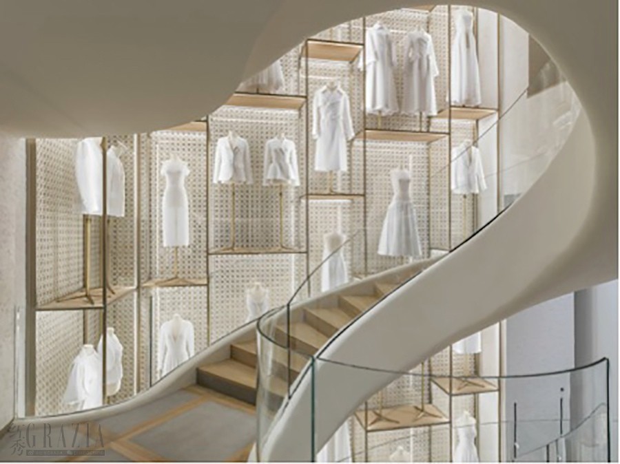 玻璃大门之后,楼梯如同蜿蜒的丝带延展而上,礼赞品牌创始人迪奥先生挚爱的柔美曲线。天然的白色织物面料,曾守卫着蒙田大道三十号的神秘瑰宝,在此构成了一幅极具诗意的壁画。这不仅体现了迪奥工坊中双双“巧手”的精湛技艺和匠心独具,也彰显了品牌不懈追求的创造力。迪奥先生在创立第一家饰品商店“Colifichets”时,曾听取艺术家好友克里斯汀·贝拉尔(Christian Bérard)的建议,由室内设计师维克多·格朗皮埃尔(Victor Grandpierre)以十八世纪经典的茹伊印花(toile de Jouy)包覆墙面,全新精品店亦选用相同印花装饰。这个品牌标志性元素,经由迪奥先生的每位继任者重新演绎,进而展现了全新精品店经久不衰的魅力与现代风范。