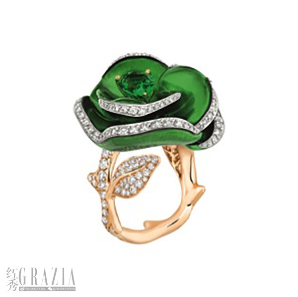 玫瑰对Dior先生的一生和工作如此重要,自然在Dior高级珠宝中也有相当的份量。Dior之花为迪奥高级珠宝部艺术总监维多利娅•徳卡斯特兰(Victoire de Castellane)提供了辽阔、无尽的灵感:以白钻或彩钻配衬「Rose Dior Bagatelle」戒指;在「Rose Dior Pré Catelan」珠宝系列中大胆采用珊瑚、缟玛瑙、玉髓及粉红水晶;甚至在「Précieuses Rose」珠宝系列里利用玫瑰环绕着置中的宝石。不过,最巧妙的灵感,并非源自花朵本身,而是它的茎部,这一创意在「Bois de Rose」珠宝系列中得以体现;维多利娅解释说:「玫瑰梗缠绕着手指,令珠宝散发柔情诗意,就像浪漫的宣告或永恒的爱情象征。」