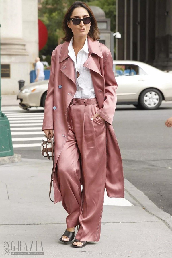 秀儿还看见街拍里有时髦精穿缎面材质的风衣,还是粉色的,这样温柔的材质和颜色组合在一起,却也没有完全丢掉风衣的洒脱感,只是多了些女人味。