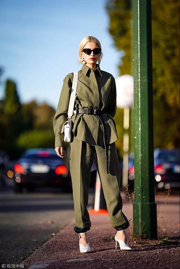 军绿色洗的西装阔腿裤配上同色系的上衣是不是军感十足!一下子会让你变成超级酷的小姐姐!