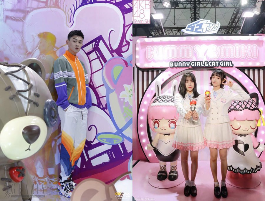 青年演员刘润南在CGCGirls×Joybrain撕裂熊展位,AKB48TeamSH毛唯嘉、刘念在52 TOY展位。
