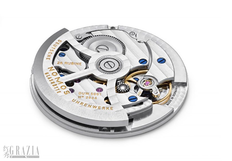 镀铑机芯表面饰有格拉苏蒂条纹与NOMOS 鱼鳞纹金色雕花