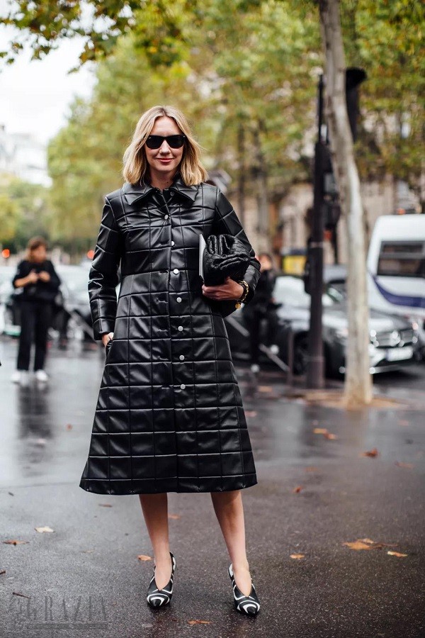长款的棉风衣除了搭配裤装外,天气不是很冷的时候露个腿,搭配一双利落简单的高跟鞋和极具造型感的包包,气场十足。