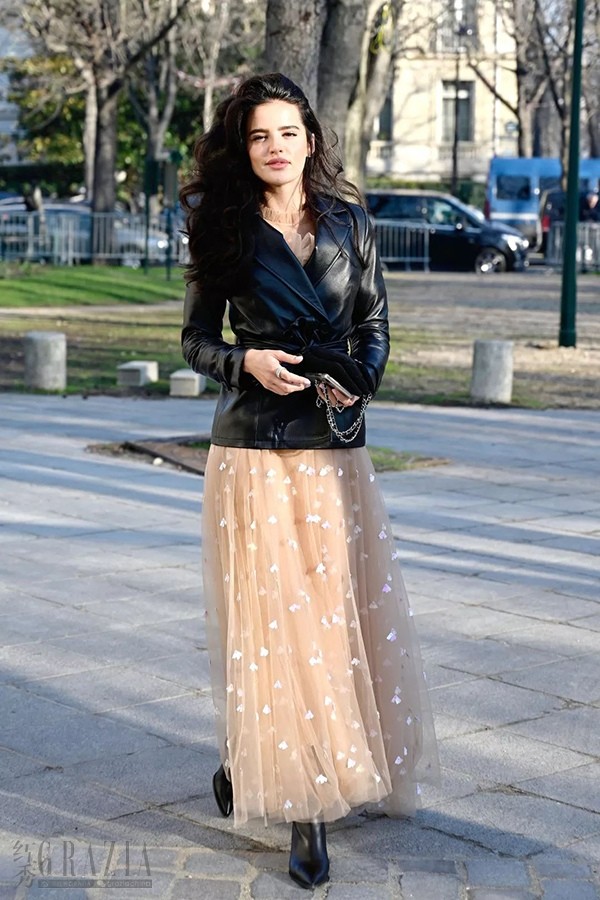 纱裙+皮夹克则更彰显个性,“酷中作柔”,同时散发出优雅和刚毅姿态。
