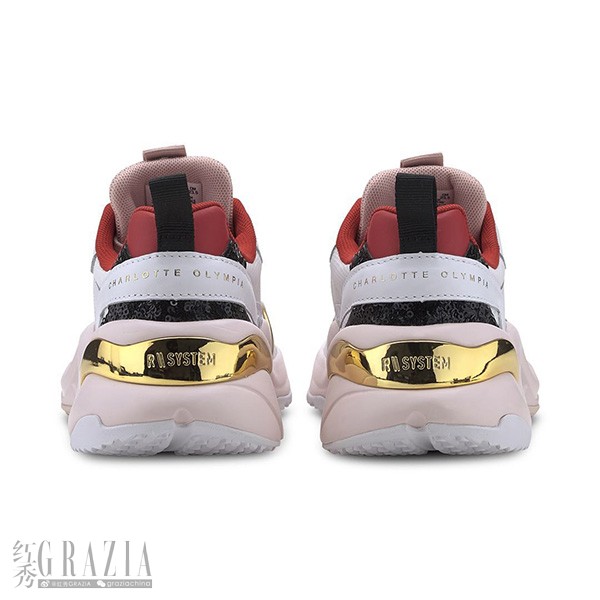 本季联名系列翻玩多款PUMA经典鞋款,并注入独特的奢华风,以全新角度演绎女性运动时尚美学。PUMA x CHARLOTTE OLYMPIA Rise鞋款沿袭了街头潮流的复古底蕴,采用网眼透气材质打造鞋面,缀以黑色漆皮覆层和红色针脚细节,帅气中尽显神秘。浅粉色中底搭载金属质感的TPU后跟稳定器,提供恰到好处的稳定性和支撑力。