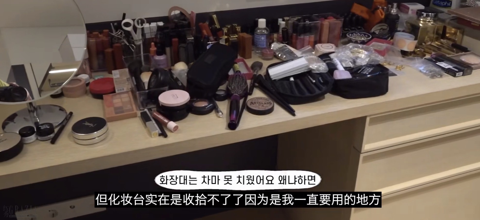 而镜头一晃,凌乱的化妆桌出现,韩艺瑟解释道这里是每天都要用到的地方,太难整理了,劝大家不要以为女明星的化妆桌都是亮光闪闪的,其实就是个战场。