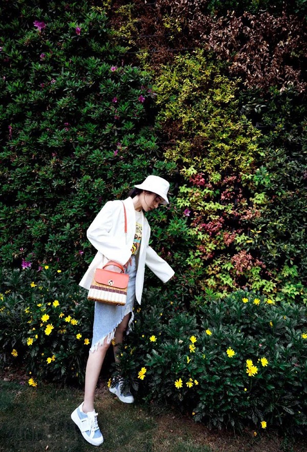 简约白色西装内搭印花T恤,不规则撕边牛仔裙带来一丝甜美气息,灵动又清新。