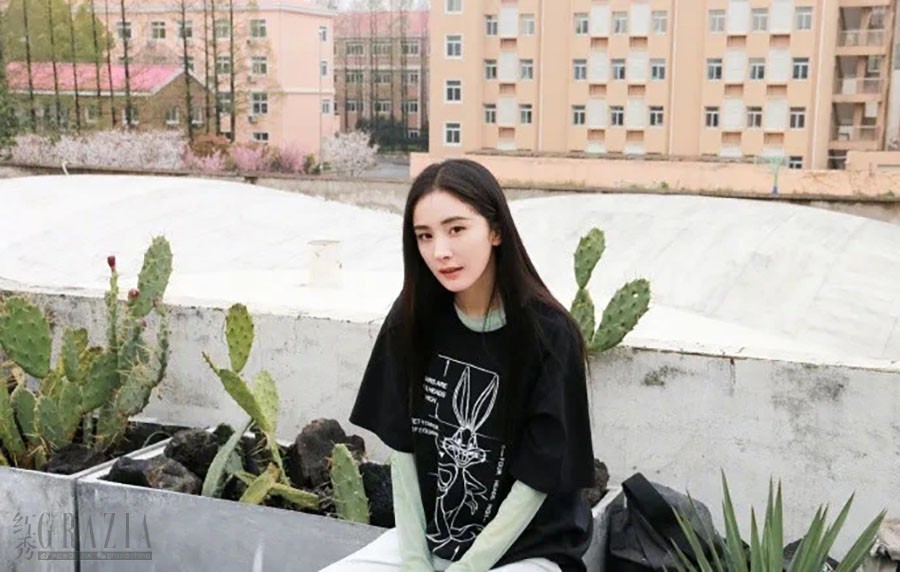 杨幂身着MO&Co. | Looney Tunes特别合作系列黑色兔八哥卡通T恤巧搭浅绿色上衣,尽显满满春日气息。