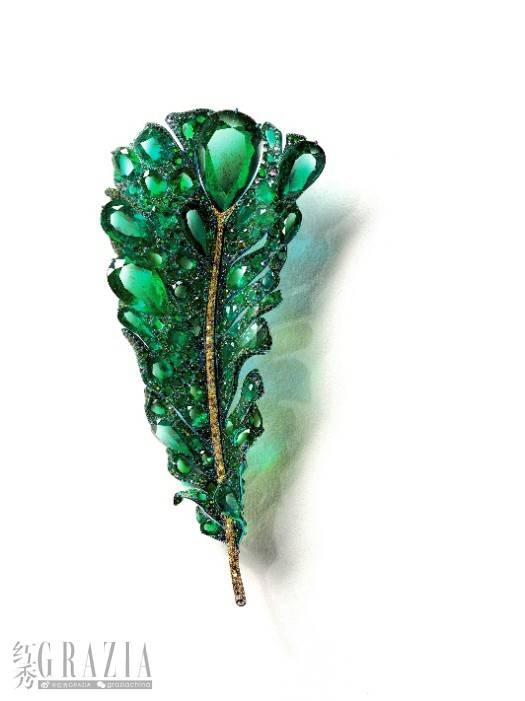 此系列胸针作品运用了坚硬的钛金属进行打造,镶嵌着质地脆弱的祖母绿主石,并通过不同切割方式、不同色泽的各式其他宝石,烘托并营造出如真实羽毛般蓬松丰厚的生命力和惊人的视觉效果。