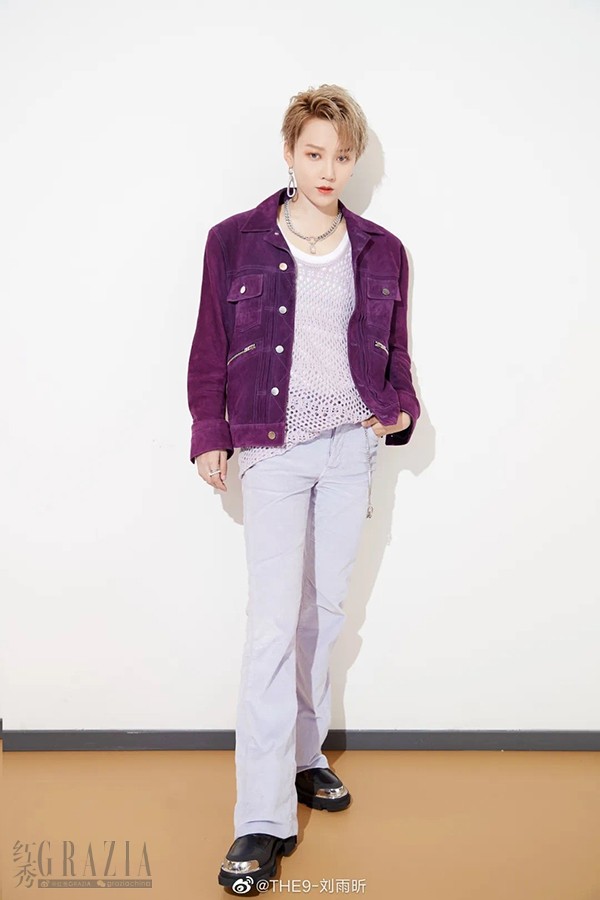 刘雨昕即使是演绎紫色都能穿成酷女孩,深紫色的灯芯绒夹克超级有范儿,银色的粗链条项链和浅紫色内搭就很适配。
