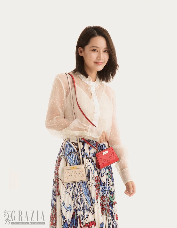 红色还是白色?李沁身穿Tory Burch白色蕾丝衬衫与蓝色印花半裙,搭配两只小巧可爱的Nano袖珍Lee包,甜蜜演绎#TSYD#(天生一对)----“我全都要”。