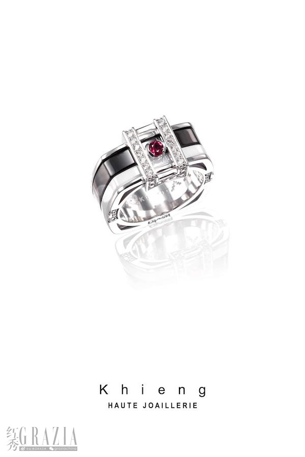 以象征无尽意结的吉祥结为发想,代表福德无尽之意,设计出象征天圆地方的戒指主体轮廓;戒指本体以18K白金搭配黑白两色精密陶瓷打造。设计师挑选红宝石为主石,镶嵌在戒指中心,代表永恒坚贞的爱,充满热情的鲜明情感;从侧面欣赏,可见独特的戒身造型,外方内圆的柔和曲线,四个角落镶嵌精选圆形明亮式切割美钻,让这款两用珠宝也可以作为极具装饰性的吊坠。男女戒环内圈均以雷射镂刻不丹传统织纹图案,代表文化传承、生生不息,而独特的爱心图腾则是源自方国强设计师钟爱的小女儿幼时涂鸦,设计师希望表达以澄澈的儿童视野,呼吁大众正视弱势妇女及儿童问题,唯有接受过爱的妇孺,未来才有能力带给更多人爱及幸福。