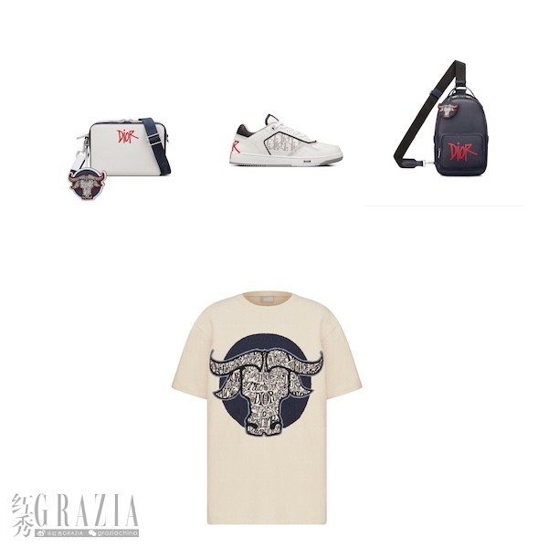 两位设计师从中国十二生肖民俗传统中汲取灵感,特别创作出迪奥二零二一牛年吉祥图腾,并以海军蓝、白色及迪奥先生誉为“充满幸运的生命之色”的红色呈现,同时饰以DIOR AND SHAWN专属涂鸦。