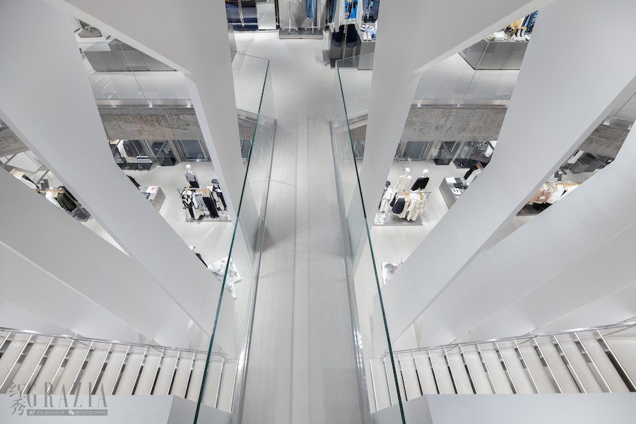 UR大上海时代广场店以“都市剧院”作为空间设计的灵感来源,从外部构造、色彩搭配、内部装饰、陈列展示等各方面诠释这一概念。店铺正面紧邻繁华街道,侧面则面向幽静小路,从两种不同角度展现出创作者的设计巧思:站在店铺正面时,呈现眼前的是店内错落有致的多层几何结构,犹如层层重叠的剧院帘幕;而从侧面看到的景象则仿佛帘幕之下的剧院后台,令人充满无限遐想。更特别的是,店铺首层以“室内街道”为设计概念,与店外川流不息的淮海路恰好平行,顾客在陈列服饰之间穿行时将获得“动静结合”的沉浸式体验。