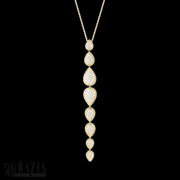 继一款璀璨夺目的大型水滴短项链后,Serpent Bohème系列推出由31枚中型水滴形图案组成的短项链。水滴形图案层叠辉映,铺镶总重达19.63克拉的钻石,以黄金圆珠环簇四周,呈现精致考究的全新佳作。此款珠宝凸显纯粹美感与高雅品味,与整个系列作品相映成辉。