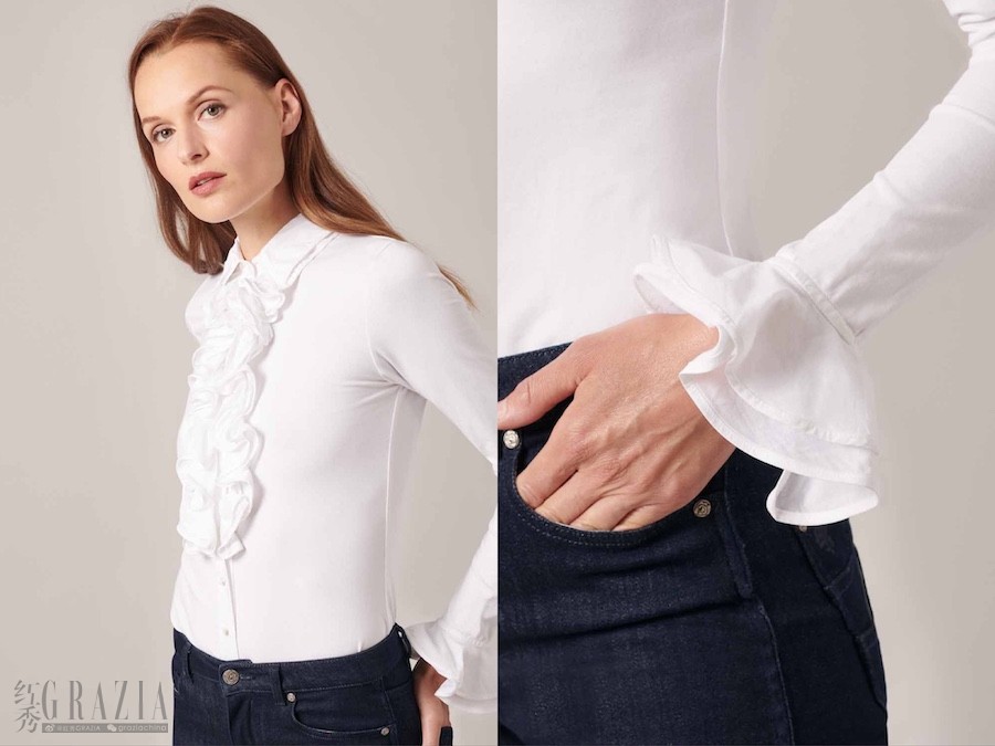 Patsy白衬衫同样是由舒适的皮马棉制成,胸前和领口皆是双层褶边的设计,时髦立体的轮廓被灵动的剪裁贯穿其中。双层叠进的袖口略带薄纱,轻轻抬起便犹如花朵般绽放,极力诠释着当代女性精致而有仪式感的生活态度,同时通过设计和细节的巧思彰显前卫的时尚主张。