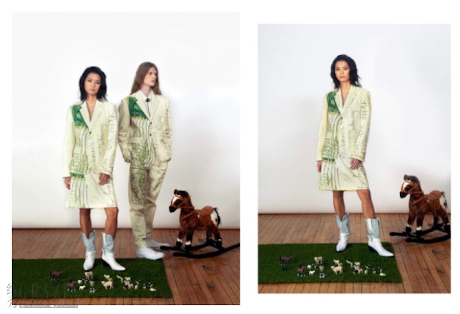 同时,品牌在此次2021年秋冬时装周上推出了首个女装系列。牛仔短外套剪裁修身,配以不对称纽扣,与延续了男装廓形和剪裁的西装外套大衣形成鲜明对比。牛仔裤则借鉴了男装风格,带给人粗犷休闲的感觉。明信片图案印花也由男装系列延续到了女款西装外套及半裙的设计上。