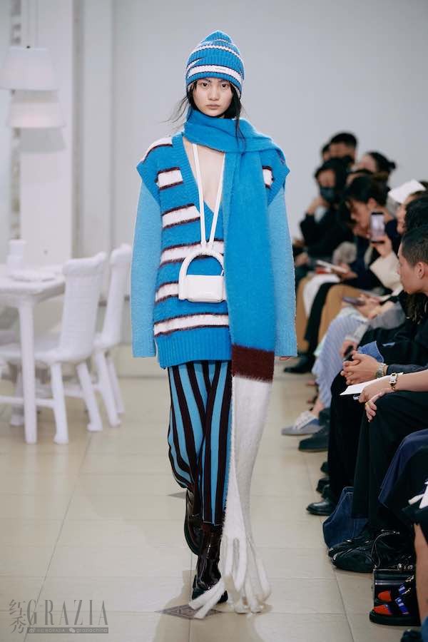 Short Sentence 2021秋冬系列“Enclose”,意为创造一个自在温暖的保护罩。灵感来自菲律宾艺术家Bea Camacho的同名行为艺术作品“Enclose”,在持续11小时的表演中,她用红色纱线将自己一点点编织起来,完全包裹进茧形织物中,以柔软、缓慢、重复的方式编织了一座温暖的保护壳,充满安全感的栖居之地。Bea Camacho选择用纱线作为载体,它天生具有美妙的手工感,舒适私密,让人联想到家的空间。而手工编织这一行为,于Short Sentence有着天然的亲近感。