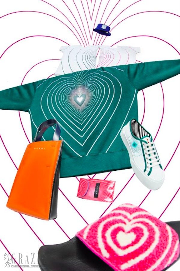 本系列囊括了男装和女装单品,从Museo包袋和Pablo运动鞋,到T恤、圆领卫衣、帽衫、渔夫帽、手机包和针织卷毛拖鞋,无限的爱心形状饰于不同单品上。图案的灵感来源于无限的电波、声波、光波,脑力波等隐形的波段扩散现象,在可视化的电子图中,以心形代替弧形波纹创造出了全新印花,呈现于七夕限定系列中。隐形的爱的能量波在MARNI眼中拥有了具体的形状,闭合的心形波纹从中心向外扩展爱心形状,如水波般缓缓蔓延。从一颗实心的爱心开始,向四周循环往复辐射出爱的力量,以温柔的振幅、柔和的速度向全世界发射爱的能量。