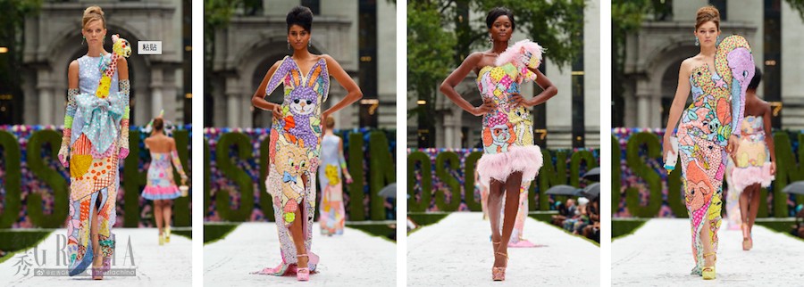 该系列最后所描绘的是一座刺绣动物园。一匹拥有粉色鹳鬃毛的3D小马驹出现在一条裙子的肩膀上。一只脖子上挂着猴宝宝的长颈鹿从一条裙子的颈边冒了出来。另一条裙子上,一只垂耳兔松软的大耳朵害羞地遮在了胸前。归根结底,这些是春季的压轴合奏,也是甜腻的反讽;在高级餐厅中享用午餐的女士们是极其优秀,这一点毫无疑问;但或许有时,她们也可能透过玫瑰色(或粉红色)的彩色眼镜看这个世界。