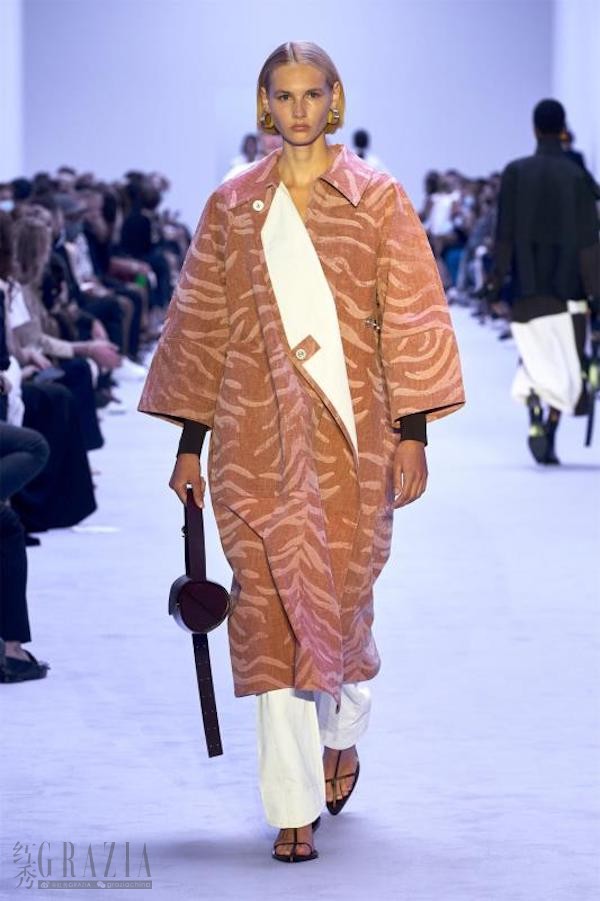 色彩,尤其是粉色系与深色系的搭配,以及印花和针织工艺的使用,是2022春夏系列的特色。天鹅绒外套上搭配虎纹印花,大号手绘条纹,以及长裙上用亮片拼成的羽状花样,无不宣示着轻松欢快的主题。
