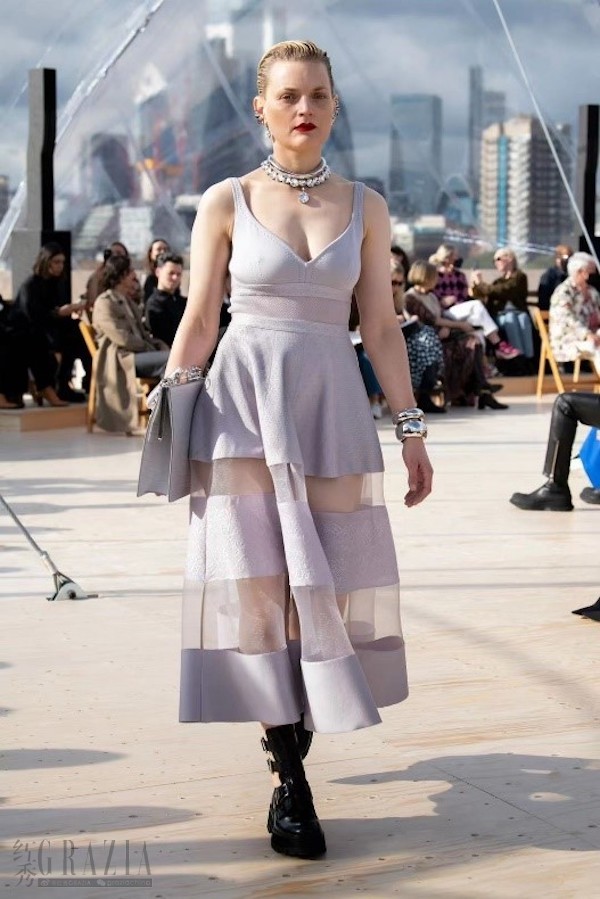 “我沉浸在伦敦这座城市的不同元素中,不管是生活的点滴,还是工作的环境。从泰晤士河畔的淤泥与河水,抬头望向天空,看到形态万千的壮阔风景。该系列的印花元素,源于我们在工作室楼顶一隅抓拍到的风景,如此幸运能够坐拥这座城市绝佳的视野,在这里我们能看到从圣保罗大教堂到伦敦眼的美妙天际线。我们观察天气的变化、捕捉云层的形态和色彩变幻,从黎明到黄昏,从碧空如洗到密云翻滚,记录下那变幻莫测的天空图景。这让我对风暴尤为着迷。我赞叹McQueen女性追逐风暴的胆魄,她们身处世界各处,时装以她们为灵感,为她们而生,因为共同的热情连结成一个坚固的团体。对风暴的关注,不仅关乎对美景的欣赏,也伴随着挥之不去的神秘和欣喜,敞开怀抱拥抱世间一切不确定性。放弃执念,直面未知,拥抱自然,在最汹涌澎湃之时,去看、去感受。与一个更广阔强大的世界,融为一体。”