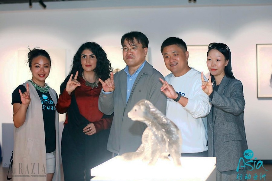 行动亚洲中国传播总监郭薴襄,英国大使馆文化教育处文化及艺术参赞Rehana Mughal莫睿,韩国京畿道经济科学振兴院重庆代表处首席代表朴耘本,ZOO GROUP创始人李京,共同以零皮草手势祝开展顺利,期待民众在欣赏后也能开展零皮草生活。