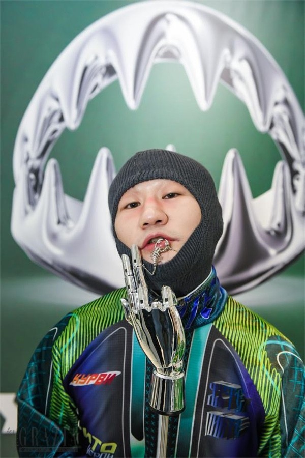 章⻥ Perception of Devilfish-由「解构」到「异化」,锋利的鲨⻮鲨⻣、扭曲缠绕的章⻥⽖,唤醒当代「钝化的感知」,视觉上的「痛感」点缀在身体之上,对未来想象的饰物交织缠绕,想象⼀种临场的跨维度体验。