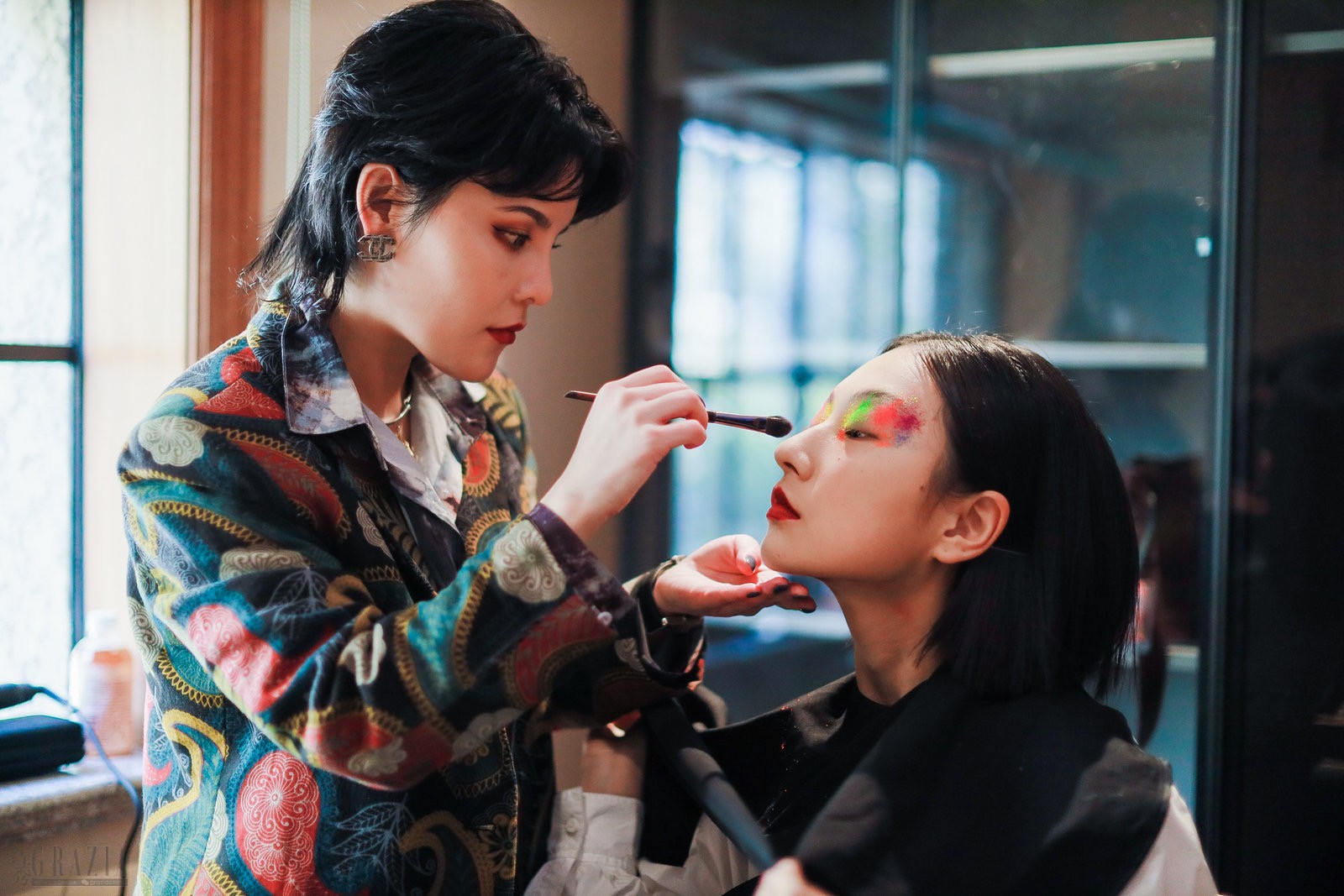 关于形与色的演绎,彩妆师也同样拥有发言权。发布会还邀请到了知名彩妆师Ada Tian,根据发布会主题现场演绎妆面的创意灵感。七八十年代嬉皮元素搭配相邻色系和撞色系的元素,通过大胆的色彩组合出别具一格的效果。两位不同领域专业人士的精彩碰撞,更凸显了新品的百变魅力。