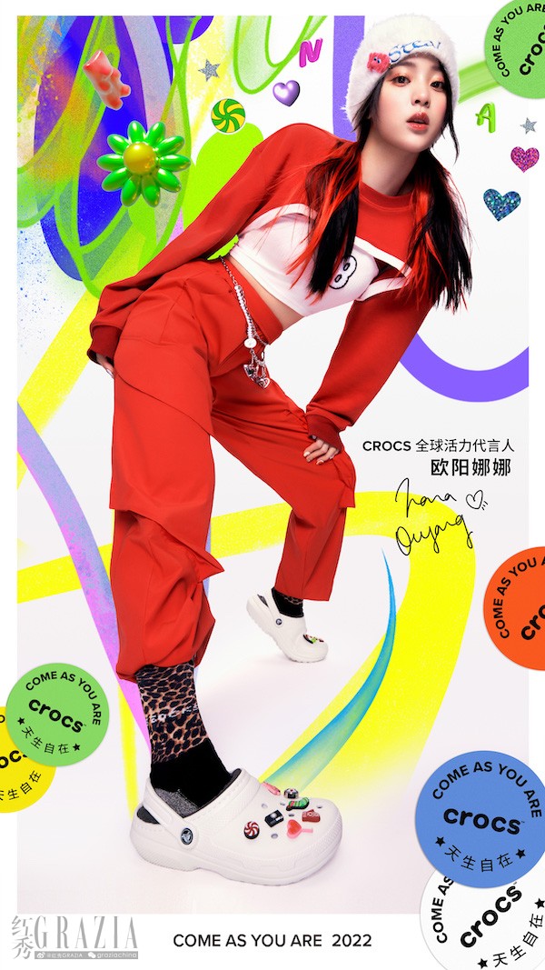 以Crocs天生自在、个性表达的品牌理念,融合欧阳娜娜率真洒脱、无惧挑战不设限的生活态度,Crocs携手欧阳娜娜一起探索更多的可能性,自在表达。