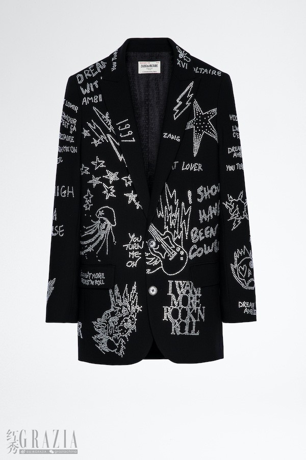 水钻西装,可搭配Phlame褶皱牛仔裤。