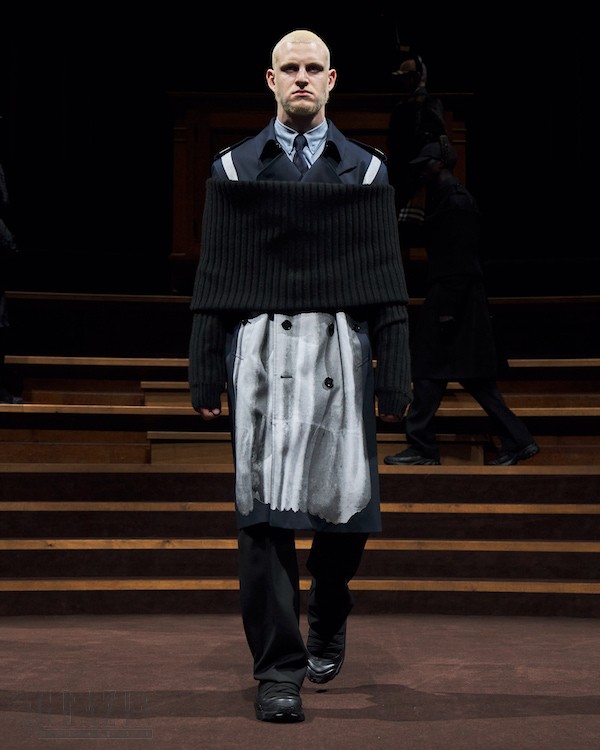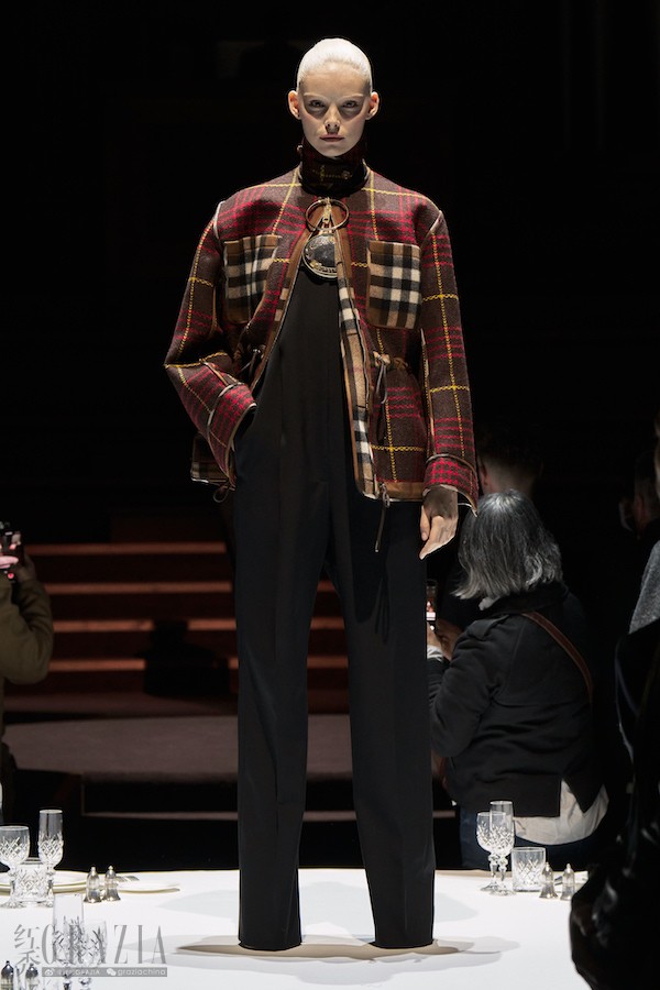 时装秀选址伦敦市中心威斯敏斯特中央大厅,新系列在一座巨大的剧院中揭幕,历史悠久的穹顶天花板和大型管风琴为其衬托。场地大厅的地板以Burberry品牌标志性棕色色调装饰,被改造成一个典雅的私人餐厅。时装秀在暗幕中开始,模特们从楼梯间缓缓而下,自观众席中穿梭而过,转而登上华丽的高桌。伴随着伦敦当代管弦乐团现场演奏Max Richter、Michael Nyman的作品,百人合唱团的吟唱牵动着观众的心弦。